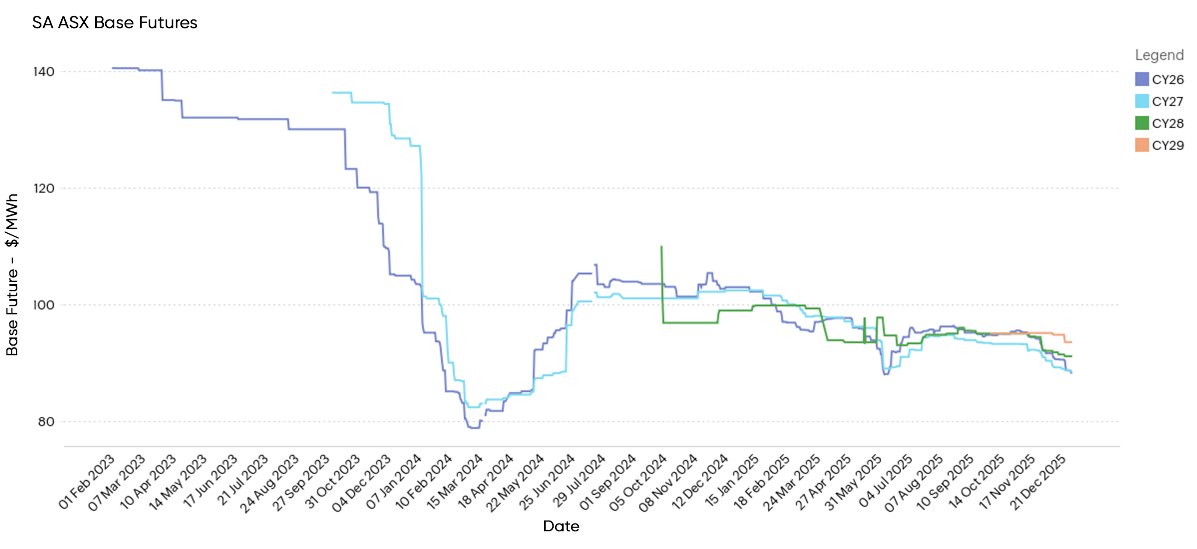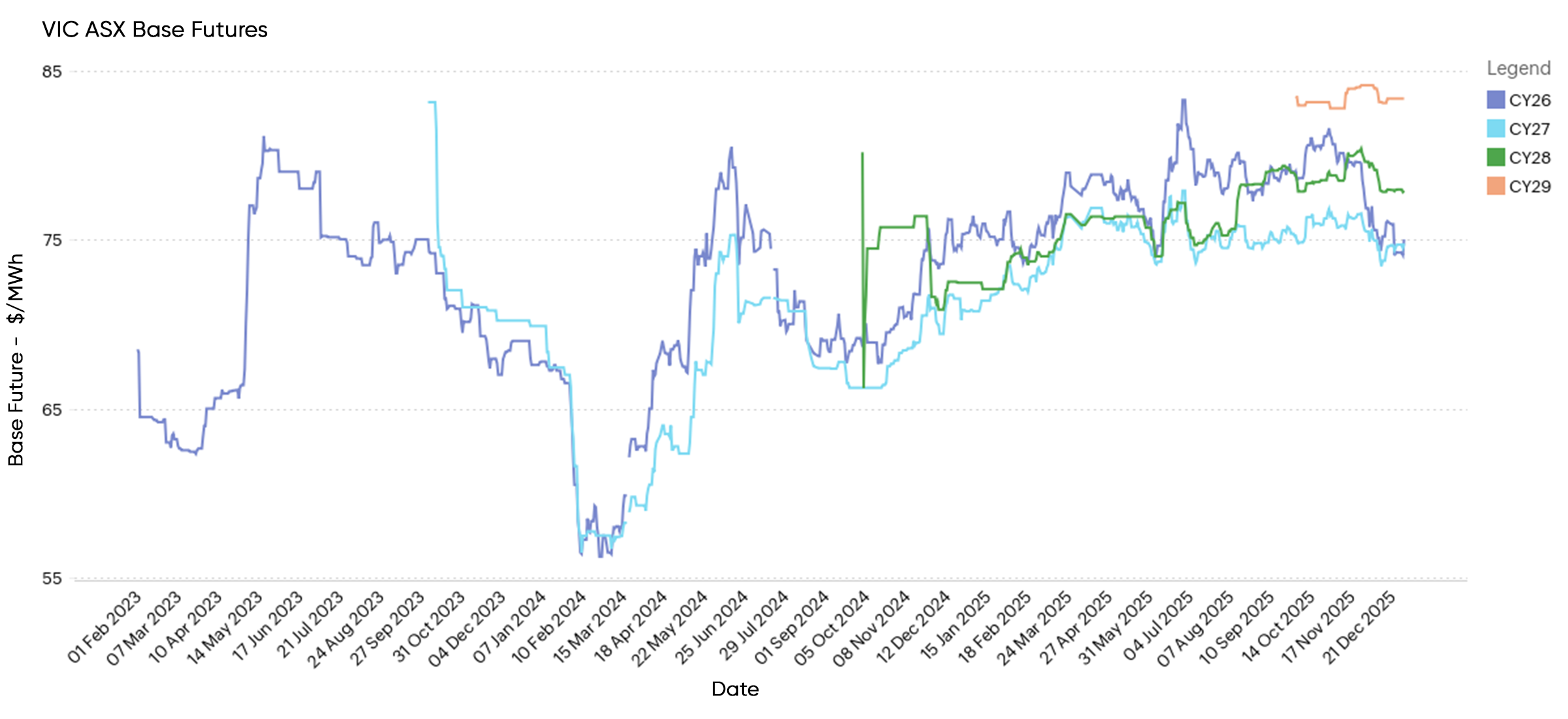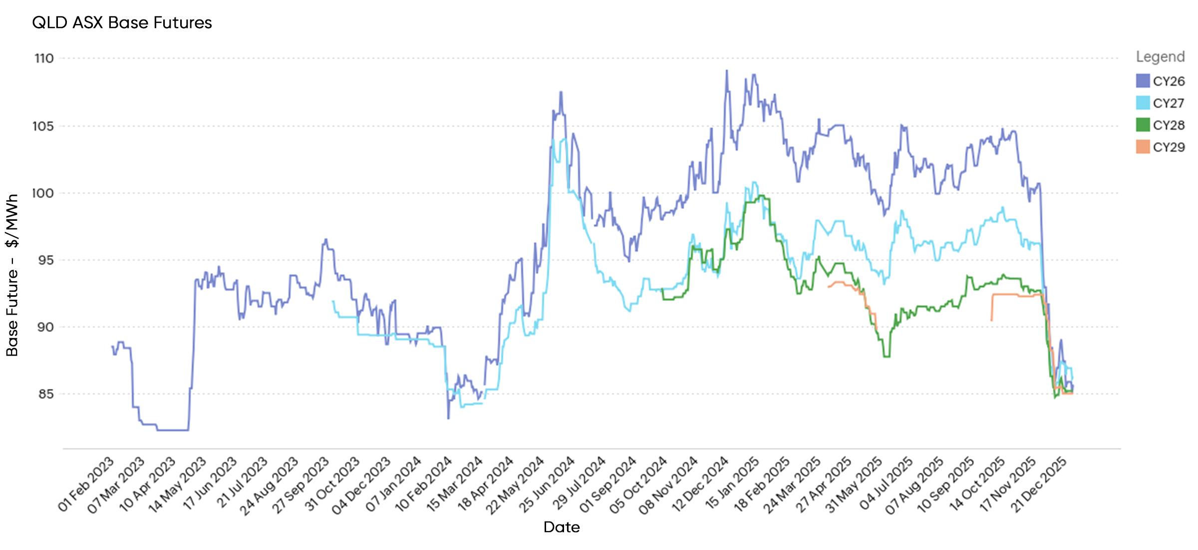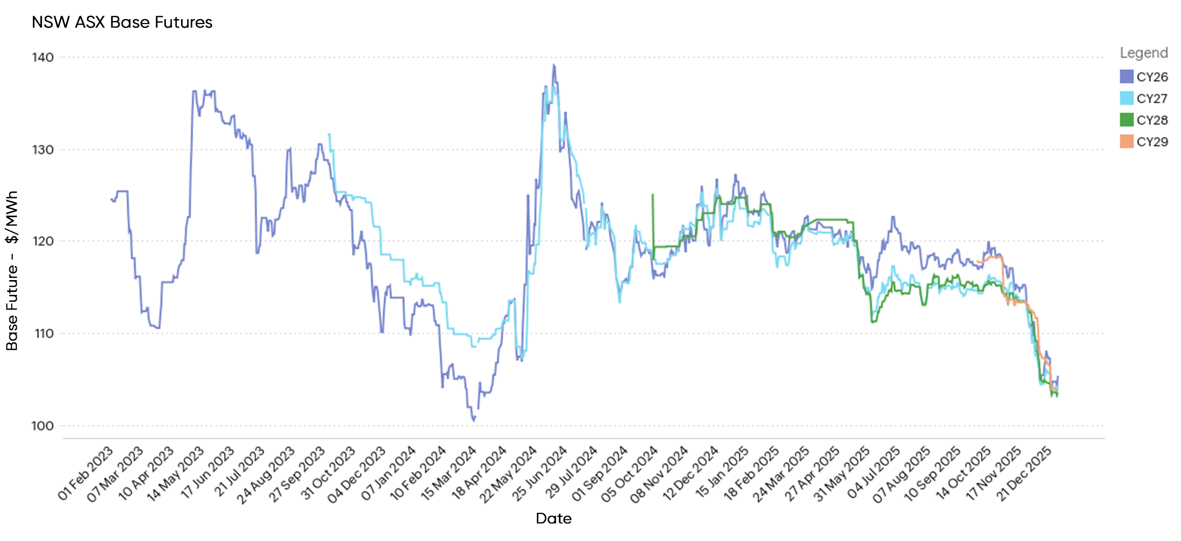 Together, these factors suggest the market was well supplied despite hot weather, reinforcing confidence in the NEM’s ability to manage sustained periods of elevated demand across multiple states, causing the futures prices to decline throughout the month of December.