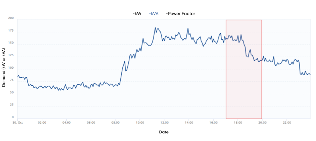 - Demand peaks to 185kVA at 11AM and sustains until 6PM, tapering off slightly to 170kVA
