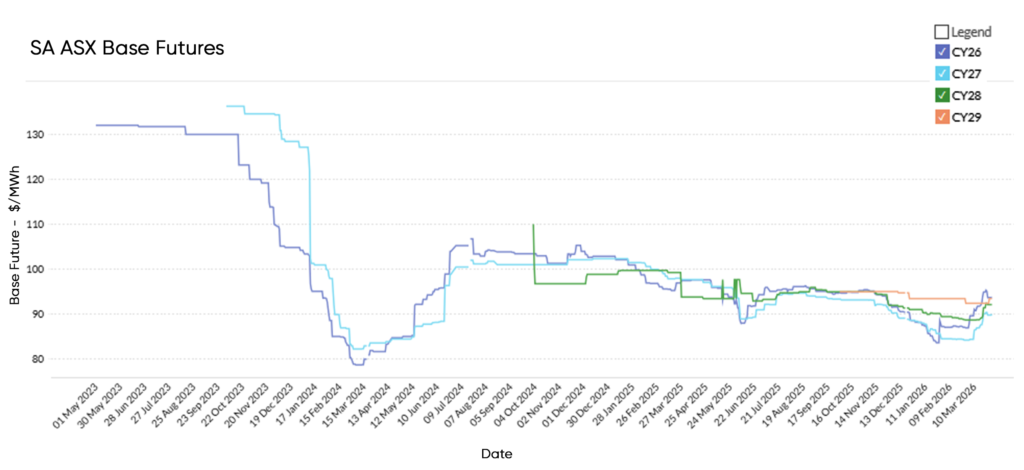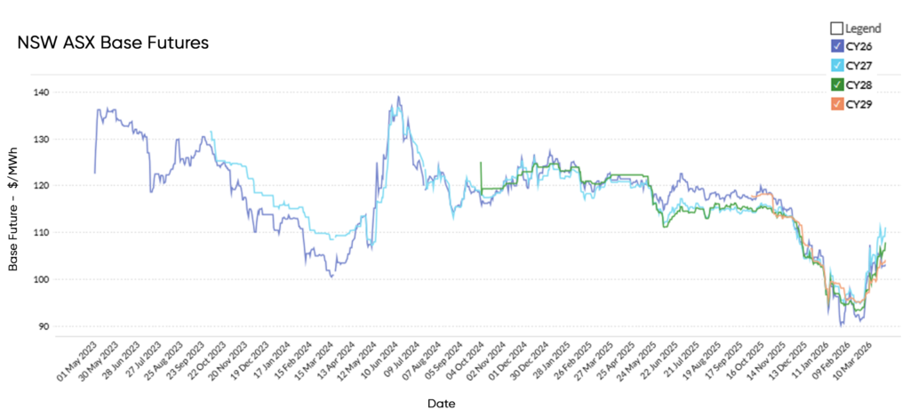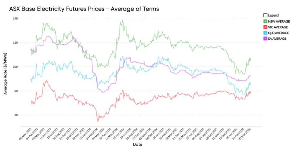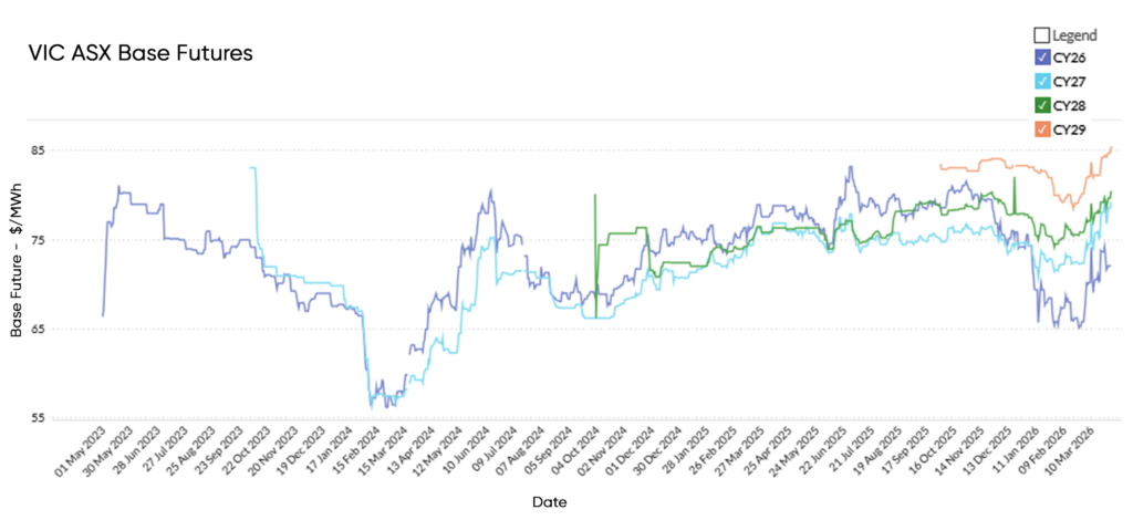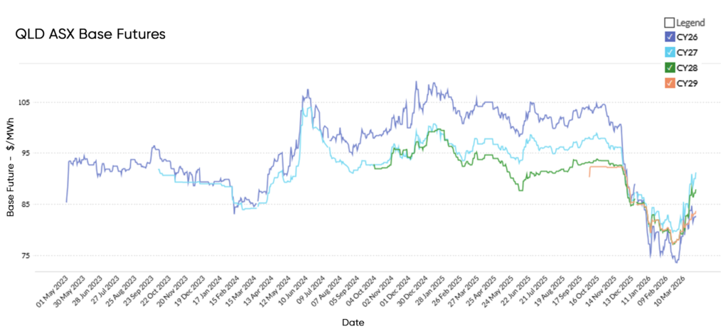 These results reflect continued strong renewable output across the NEM and reduced reliance on higher-cost thermal generation. At the same time, rising futures prices suggest market participants are factoring in emerging risks, including global energy market volatility and potential changes in fuel cost expectations.
