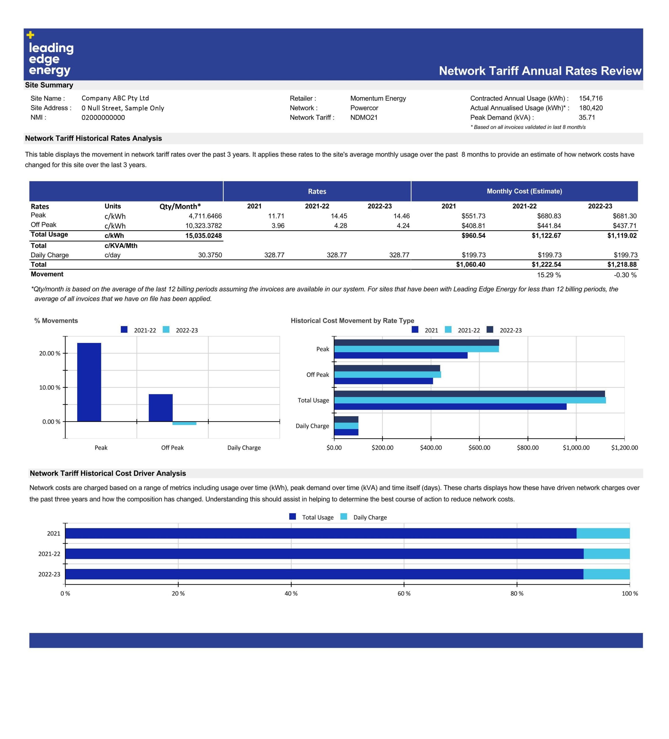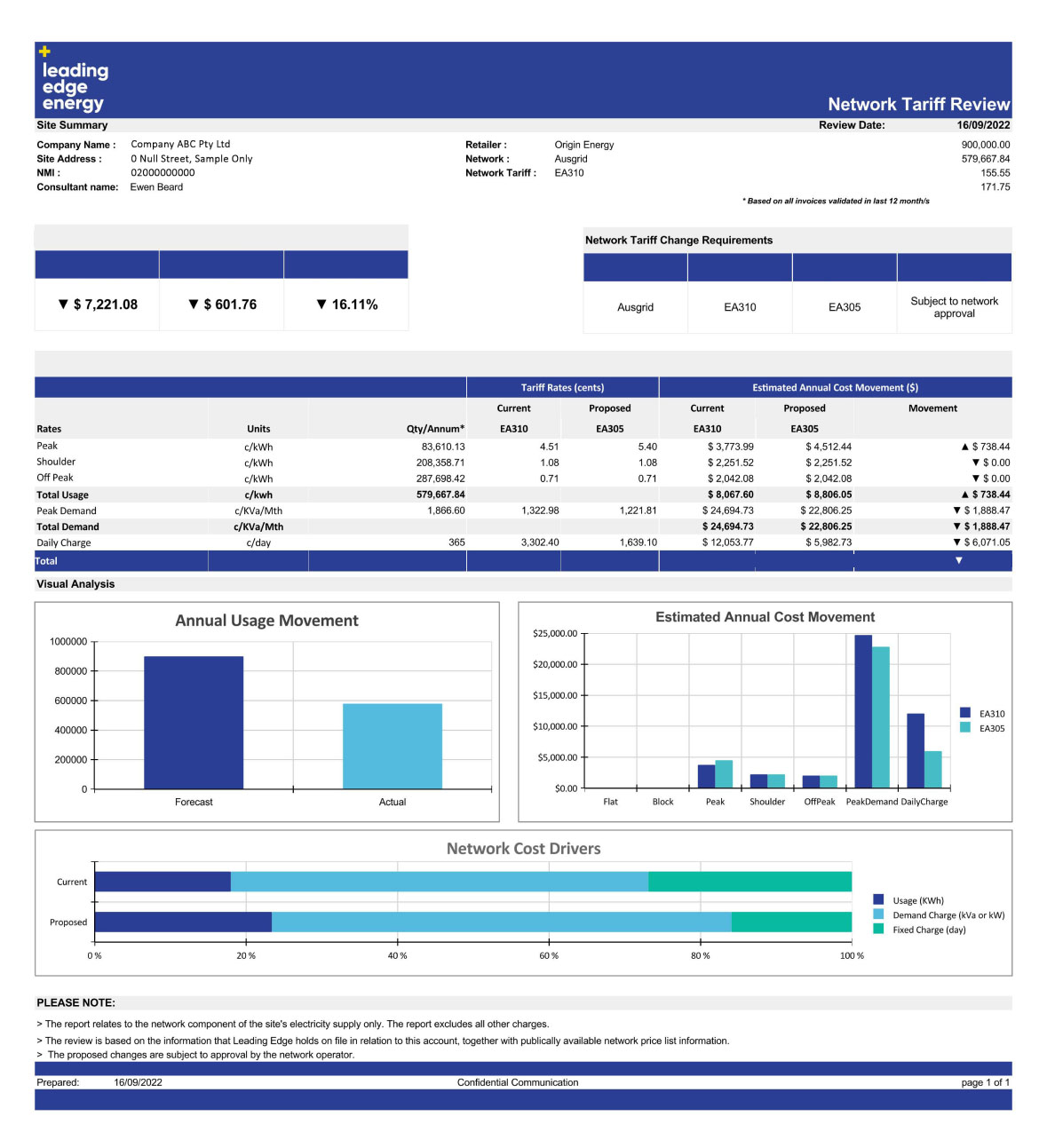 Leading Edge Energy’s Annual Network Tariff report can help you understand how your consumption affects the suitability of your designated Network Tariff code. You may use this as a guide if you want to review your consumption during a certain month? How can you improve this so you’re more efficient? Our report can help you find the answers to these questions so you can make energy-smart decisions.